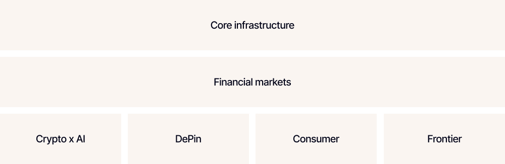 Operating at the epicenter of more crypto-native VC relationships than anyone globally gives us unparalleled deal flow. We leverage this network to execute targeted co-investments, allowing us to eliminate portfolio blind spots and aggressively double down on the sectors seeing breakout adoption. This tactical layer ensures we maintain high-conviction exposure where it matters most.